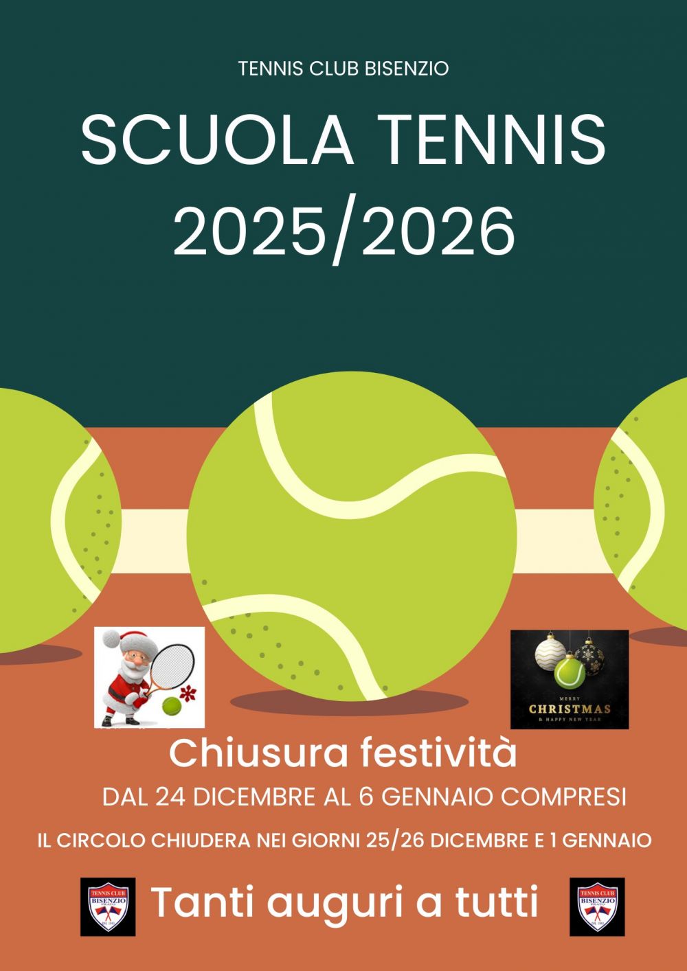vi informiamo che la “Scuola Tennis” interromperà l’attività in occasione delle prossime festività da mercoledì 24 dicembre a martedì 6 gennaio. Di conseguenza l’ultimo giorno di lezioni sarà martedì 23 dicembre e la ripresa è fissata per mercoledì 7 gennaio 2026.