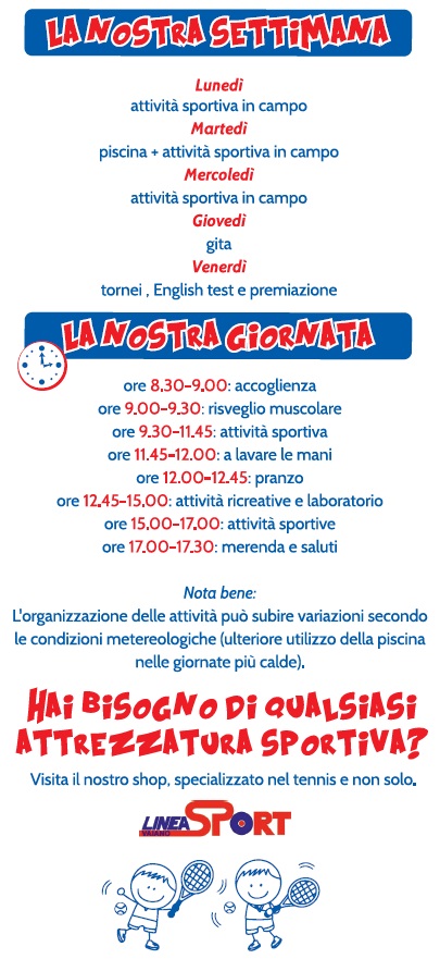 English Tennis: impariamo a giocare usando l´inglese, durante la settimana verranno organizzate attività per sviluppare la conoscenza della lingua utilizzando i giochi sportivi.
