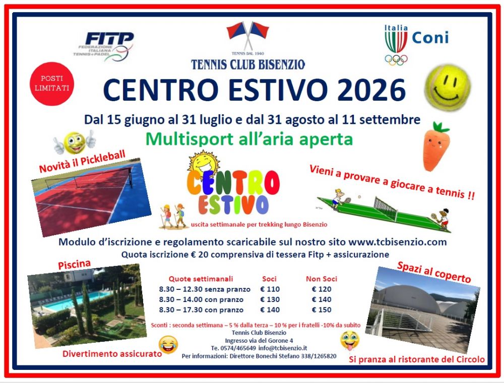 Il Tennis Club Bisenzio vi invita a partecipare al "Centro Estivo 2026" per trascorrere un estate all'insegna dello sport (con la novità del Pickleball), del divertimento, in sicurezza e tranquillità.