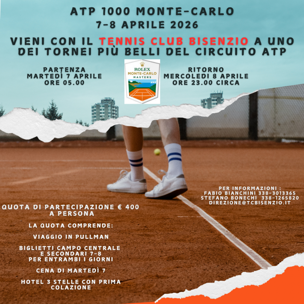 Siamo lieti di comunicare ai Soci, Allievi e a tutti gli Appassionati di tennis la gita che organizzeremo per il Torneo Atp 1000 al Monte-Carlo Country Club nei giorni 7-8 aprile 2026.